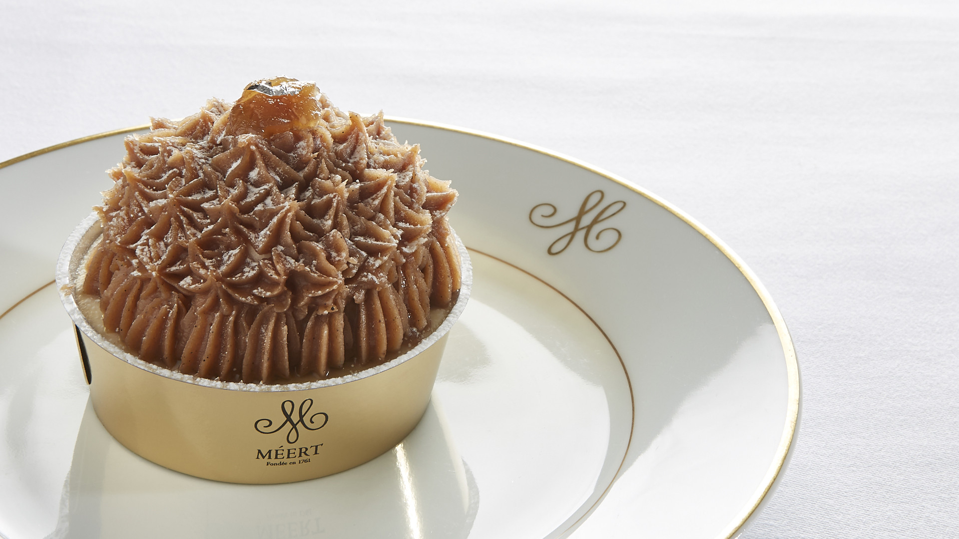 Mascarpone cream, chestnut chips, meringue, chestnut cream. Contains: egg, milk, bovine gelatin
